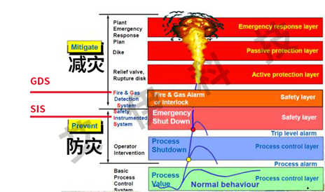 從圖中可以看出GDS系統(tǒng)是在氣體泄漏以后進行報警提醒,屬于減災層面,而SIS系統(tǒng)的緊急停車等系統(tǒng)更多屬于防災層面,二者并不屬于相同的安全保護層。同時當SIS系統(tǒng)故障時,更需要獨立的GDS系統(tǒng)發(fā)揮功能。