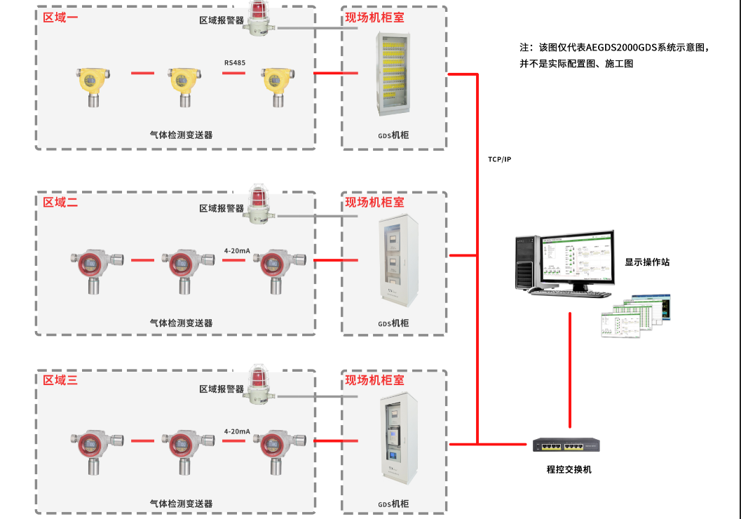AEGDS2000型可燃氣體和有毒氣體檢測報警系統(以下簡稱GDS系統)是根據石油、化工等行業要求研發的一套報警系統。系統由氣體檢測變送器、報警控制器/柜、斷路器、UPS電源、交換機、串口設備聯網服務器、上位機以及各種配件等組成。
