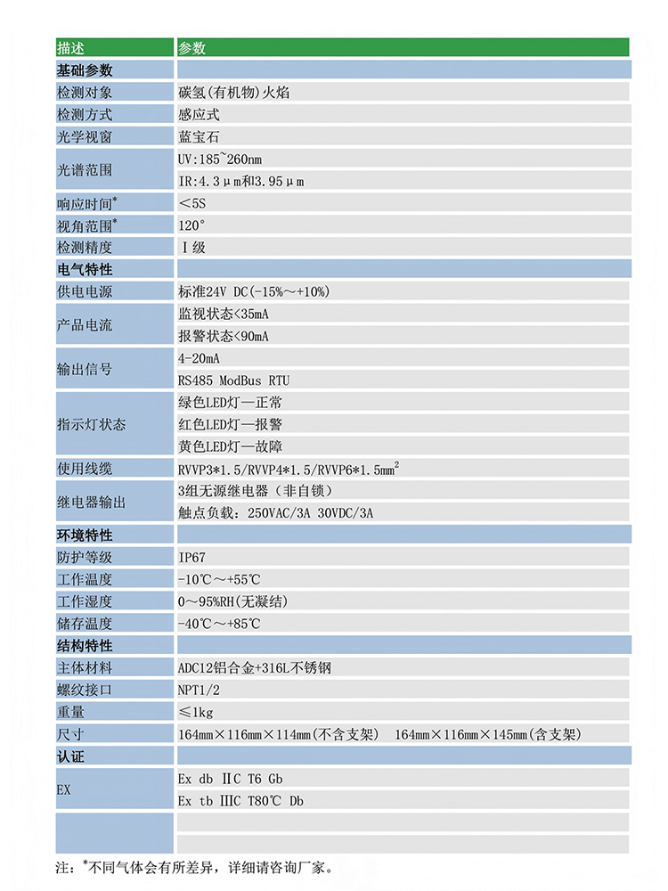 | 名稱:火焰探測器 檢測原理:感光式 光譜范圍:UV:185~260nm/IR1:4.3μm/IR2:3.95μm 玻璃材質:藍寶石 | 防爆等級:Ex db ⅡC T6 Gb/Ex tb ⅢC T80℃ Db 防護等級:IP67 響應時間:<5s 工作溫度:-10℃~+55℃ |
